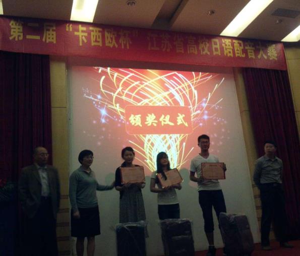 2014年5月17日,我校日语专业二年级学生黄雨凝、张颖、董煜琪、徐天�同学,在周升干老师的带领下,参加了在南京航空航天大学举办的第二届“卡西欧杯”江苏省高校日语配音大赛。虽然我校参赛选手还只是二年级的学生,但他们良好的日语基本功在众多兄弟学校的参赛选手中脱颖而出,获得二等奖的好成绩,为苏州大学外语学院赢得了荣誉。我们向各位参赛同学和指导老师表示热烈祝贺。