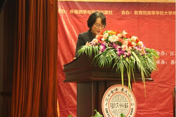苏州大学副校长蒋星红教授在致辞中首先对各位领导、嘉宾、评委、参赛选手及其指导教师的到来表示热烈欢迎,并向各位专家学者的到来表示衷心感谢。随后,她向大家简要介绍了苏州大学逾百年的办学年历史、在学术科研方面取得的成就、我校外语教学的传统优势以及近年来在外语教学方面举得的一系列标志性成就。她表示苏州大学会为本次所有参与赛事的人员提供优质服务,并预祝比赛取得圆满成功。
