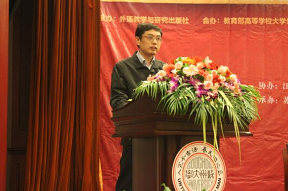 11月6-8日,2014年“外研社”杯全国英语演讲大赛江苏赛区决赛在我校如期举行。本次大赛由外语教学与研究出版社主办,教育部高等学校大学外语教育指导委员会、教育部高等学校英语专业教学指导分委员会合办,江苏省大学外语教学研究会协办,苏州大学承办。6日晚, 组委会在校本部敬贤堂举行了简短而隆重的开幕式。开幕式由外国语学院院长王腊宝主持。