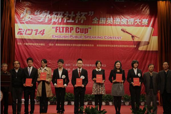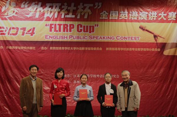 11月8日,2014年“外研社”杯全国英语演讲比赛江苏赛区决赛落下帷幕,经过两天的激烈角逐,来自江苏省76所高校的152名在校本科生共决出特等奖3名,一等奖15名,二等奖 22名,三等奖54名。我校外国语学院的刘梦轩同学凭借独到的见解、自信的表达、清晰的发音荣获得本次大赛特等奖第一名。她将与其他两名特等奖获得者代表江苏赛区参加在北京举行的全国总决赛。