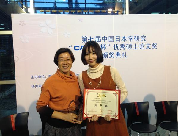 2014年11月6日,第七届中国日本学研究“卡西欧杯”优秀硕士论文奖颁奖典礼在北京日本学研究中心隆重举行。北京外国语大学副校长闫国华,中国日语教学研究会会长、北京日本学研究中心主任徐一平,日本驻华大使馆公使山本恭司、参赞横井理夫,北京日本文化中心所长吉川竹二等参加了颁奖典礼。我校外国语学院施晖教授指导的2014届日语语言文学专业硕士研究生高晓璇荣获三等奖。