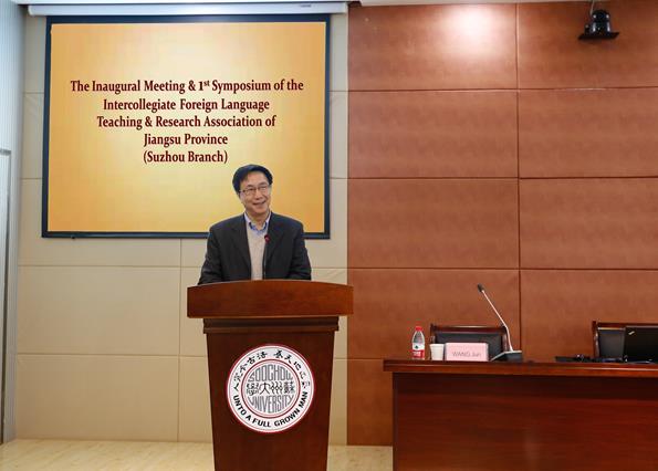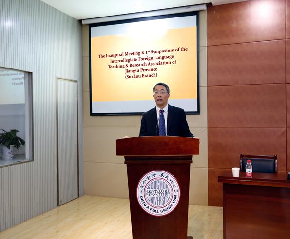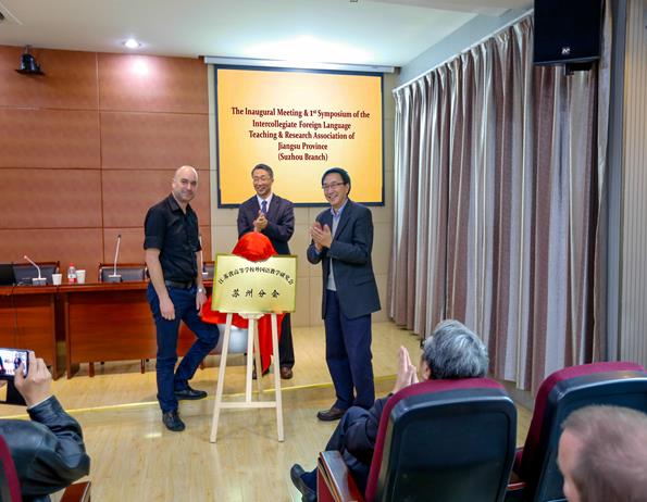 本次研讨会期间,江苏省高等学校外国语教学研究会会长李霄翔教授代表省研究会应邀向大家宣布了江苏省高等学校外国语教学研究会对于苏州分会成立申请的批复以及分会的基本组织和领导机构,并发表了热情洋溢的讲话,他希望在苏高校各外语教学单位之间加强联系,大力推动资源共享,积极探索交流合作的经验,为提高本市的高校外语教学水平做出更大的贡献。致辞结束以后,他还应邀和我院院长王腊宝教授以及西交利物浦大学语言中心主任Stuart Perrin博士共同为新成立的江苏省高校外国语教学研究会苏州分会揭了牌,自此,江苏省高等学校外国语教学研究会苏州分会正式成立。