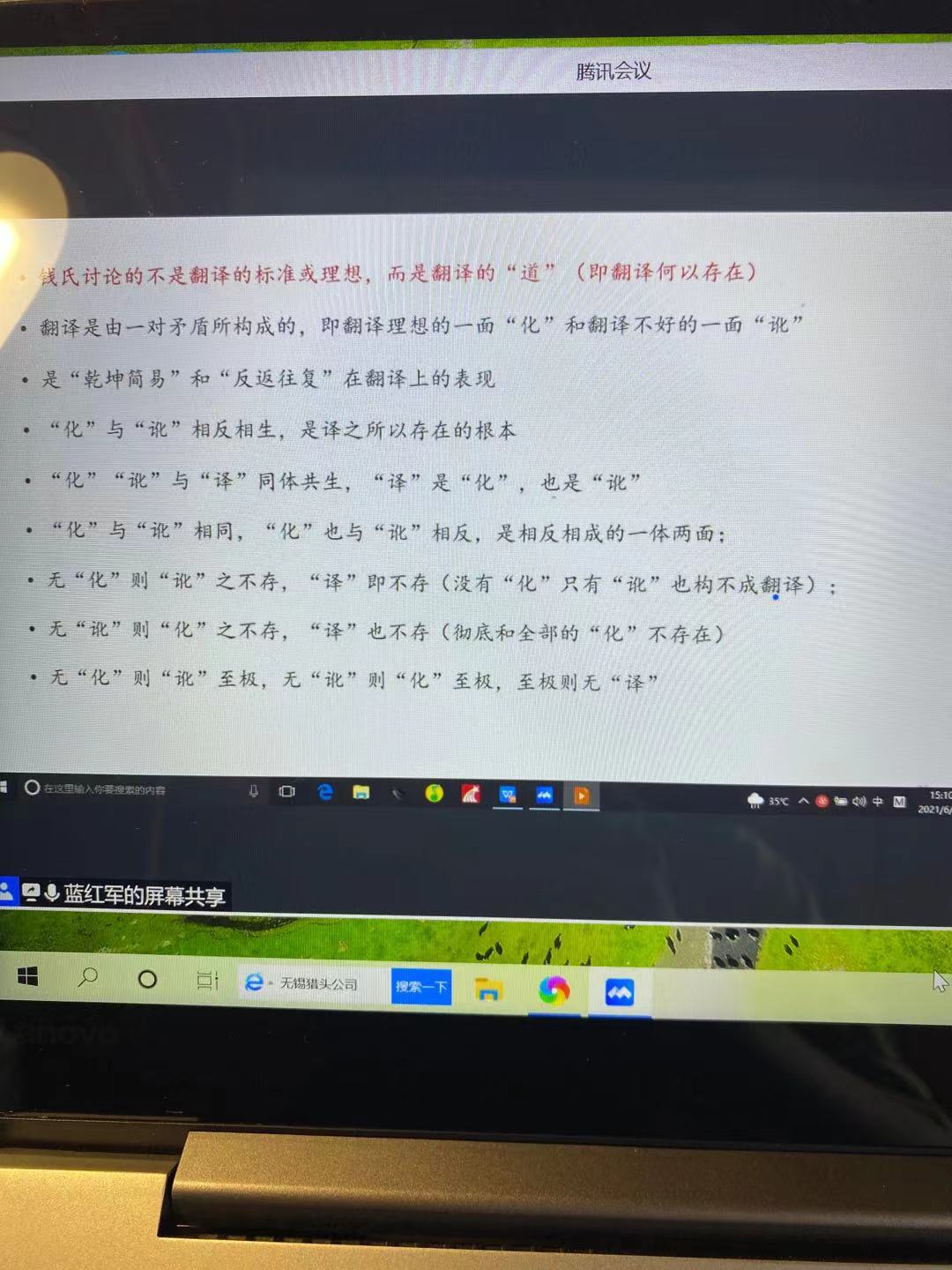 2021年6月21日下午,广东外语外贸大学博士生导师蓝红军教授应邀在腾讯会议为苏州大学外国语学院师生做了一场学术讲座。讲座题目为“认识中国传统译论的“理论性”——以钱锺书的“化境”论为例”。本次讲座由我院江苏高校哲学社会科学重点研究基地“中国文化翻译与传播研究基地”负责人陈大亮教授主持。