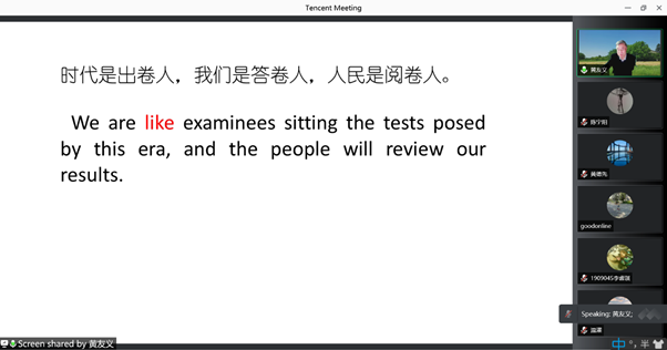 2021年11月17日14:30-16:00,中国译协常务副会长黄友义教授通过腾讯会议平台,应邀为我院师生讲学。讲座由中国文化翻译与传播研究基地主任陈大亮教授主持,主题为“学深悟透、精准翻译、有效传播——参加党政文献翻译的体会”。有来自学院及全国其他高校近150名师生参与了此次在线讲座。