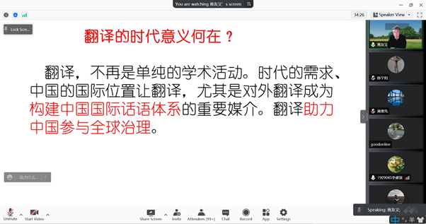 讲座初始,黄友义教授概括介绍了讲座主题的背景,提出“翻译的时代意义何在?”这一议题。指出百年大变局之中翻译重要性愈发凸显,准确的外译让我们了解世界,精准的中译帮助我们构建中国的国际话语体系。接着,他从学深悟透讲起,分享了自己在党政文献英译实践中的心得,从“积极稳妥推进大部制”、“传承红色基因”等表达的英译过程入手,提出“翻译的过程是学习的过程”,强调反复研读推敲原文内涵、充分到位理解原文旨意的重要性。