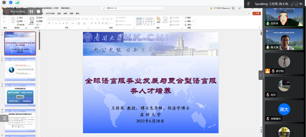 2022年6月28日9:30-12:00,南开大学外国语学院王传英教授通过腾讯会议平台,应邀为我院师生讲学。讲座由中国文化翻译与传播研究基地主任陈大亮教授主持,主题为“全球语言服务业发展与复合型语言服务人才培养”。全球语言服务业概览、我国语言服务业发展的基于与挑战、复合型语言服务业人才培养三方面分享了自己最近的研究成果和心得,共有学院及其他高校近80名师生参与了近两个半小时的在线讲座。