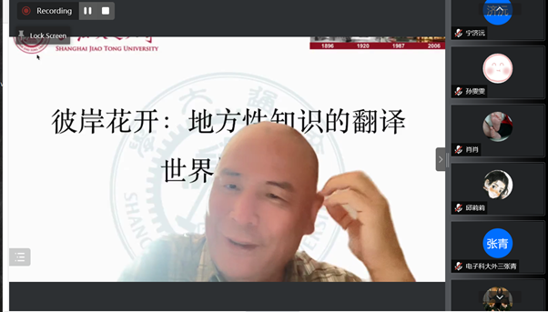 2022年7月15日14:30-16:00,上海交通大学外国语学院杨枫教授通过腾讯会议平台,应邀为我院师生讲学。讲座由中国文化翻译与传播研究基地主任陈大亮教授主持,主题为“彼岸花开:地方性知识的翻译世界性认同”,共有学院及其他高校200余名师生参与了两个小时的在线讲座。